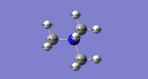 By looking at fig. 6 the results of the charge distribution from the NBO analysis are as expected, the central nitrogen atom is electronegative hence bright red (-0.396), the hydrogen atoms are highly electropositive and so are green whereas the carbon atoms, which are in between are dark red/wine coloured.