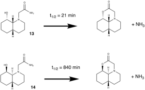 Peptide hydrolysis This introduces a further example of how simple conformational analysis can quickly rationalize kinetic behaviour. At neutral pH and 25° the half life for hydrolysis of a peptide bond is around 500 years (and thank goodness, or we would ourselves all rapidly hydrolise to a mush!). Some enzymes however can achieve this in less than 1 second, an acceleration of 1013! Organic chemists are not quite so clever, but they can achieve room temperature hydrolysis of a peptide in 21 minutes by careful conformational design. The two isomers shown on the right differ only in their stereochemistry, one hydrolysing quickly, the other slowly. Build a model of each compound, and calculate two isomers for each, varying in whether the ring N-substituent is oriented axial or equatorial with respect to the decalin ring. On the basis of your two pairs of energies, can you rationalise the observed kinetic behaviour? Do you know why both of these compounds take very much less than 500 years to hydrolise the peptide bond?