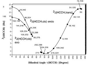 M. Karplus, Vicinal Proton Coupling in Nuclear Magnetic Resonance, J. Am. Chem. Soc., 1963, 85, 2870 - 2871; DOI:10.1021/ja00901a059