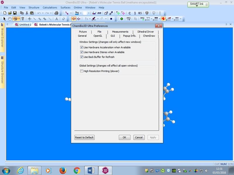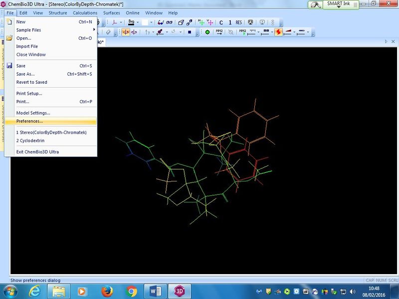 To access the Chem3D program settings, click on File, then Preferences to display the options on the right. Ensure that the Use Back Buffer for Refresh checkbox is ticked, then click Apply and then OK (see below):