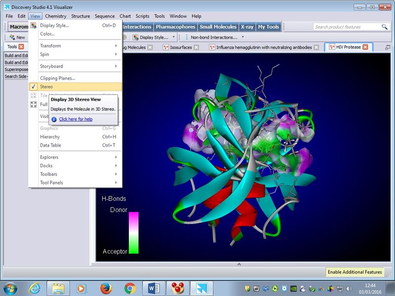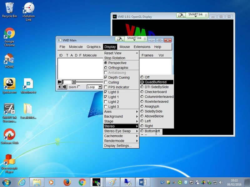 VMD is a molecular visualization program for displaying, animating, and analyzing large bio molecular systems using 3-D graphics. Pleaseuse the display settings shown in the image below to render output via the 3D projector: