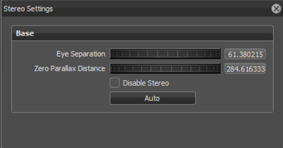 Eye Separation: Sets viewer’s eye left and right eye distance in millimeters. Zero Parallax Distance: Sets viewer’s focus distance. This distance is the distance to a plane where the images for both eyes match. Disable Stereo: Disables stereo rendering. Auto: Calculates the Eye distance depending on the view distance.