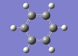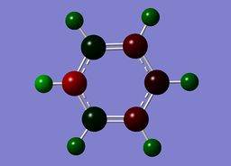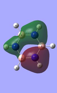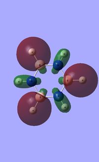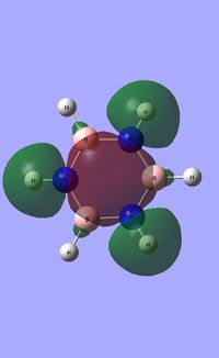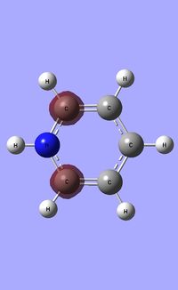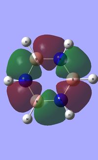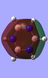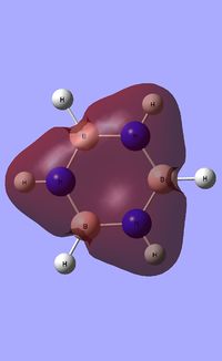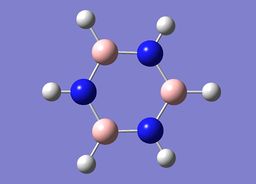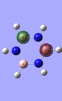 A Borazine molecule was created using GaussView and was subjected to an optimisation calculation [OPT] using B3LYP as the method and a basis set of 6-31G(d,p).