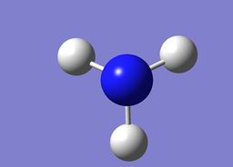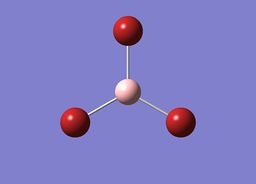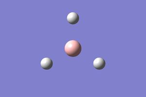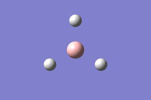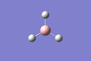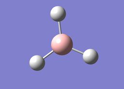 A BH3 molecule(shown below) was created using GaussView, with each B-H bond fixed at a length of 1.5 A. The BH3 molecule was subjected to an optimisation calculation [OPT] using B3LYP as the method and a basis set of 3-21G. The B3LYP method is related to the approximations enforced during the Schrödinger calculation and the basis set 3-21G determines the accuracy. Although 3-21G is of low accuracy it results in a very rapid calculation.