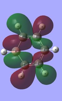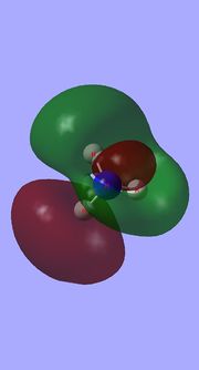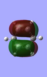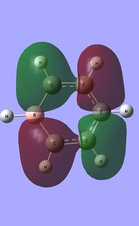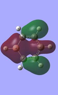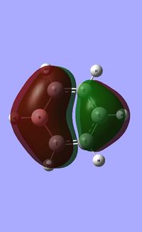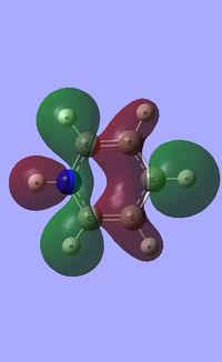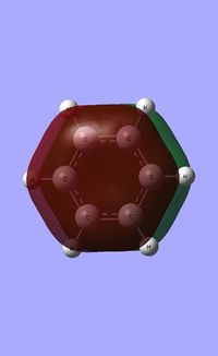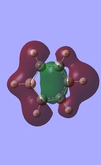 Due to the symmetry asssociated with benzene and borazine, both molecules contain a doubly degenerate HOMO. This degeneracy is lost in the case of boratabenzene and pyridiunium as a consequence of the heteroatoms present. Nitrogen [electronegative] causes a lowering in the energy of the molecular orbital, whilst boron [electropositive] causes a raising in energy. The benzene HOMO,shown in the table above, contains a nodal plane that is perpendicular to its degenerate molecular orbital. In contrast to the polarised electron density towards boron observed within the HOMO of boratabenzene; the HOMO-1 has a distinct absence of electron density on the boron atom [as shown by the LCAOs above], with a nodal plane passing through the para boron and carbon atoms. In accordance with the electropositivity of boron, this lack of electron density surrounding the boron has a stabilising effect, hence this molecular orbital is lower in energy than the boratabenzene HOMO. Significant deviations in electron density distribution are also observed within the HOMO and HOMO-1 of pyridinium. Unlike the HOMO of pyridinium, where the nitrogen is relatively bare with regard to electron density; the HOMO-1 shows a significant localisation of electron density on the electronegative nitrogen atom,which is isolated by a nodal plane passing across the ortho carbons. As a consequence of nitrogen's electronegativity, this build up of electron density has a stabilising effect, hence the lower energy of the HOMO-1 of pyridinium. The LCAO above depicts the distribution of charge within the HOMO-1, the larger nitrogen 2p orbital exerts an electron-withdrawing effect, reducing the electron density on the adjacent carbons. The borazine HOMO [shown in the table above], features a nodal plane across the ring structure and an asymmetric electron density distribution with more electron density observed on the N-B-N unit due to the electronegativity of the nitrogen atoms. It should be noted that the reduced aromaticity of borazine compared to that of benzene is a consequence of the alternating boron and nitrogen atoms present. The electropositive boron atomic orbitals contribute more to the anti-bonding molecular orbitals whereas the electronegative nitrogen atoms contribute more to the bonding molecular orbitals. This disparity in orbital coefficients causes an uneven distribution in pi electron density and hence the lower aromaticity observed.