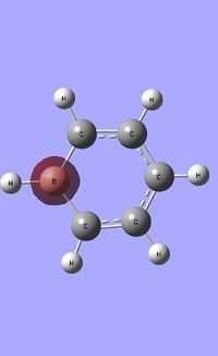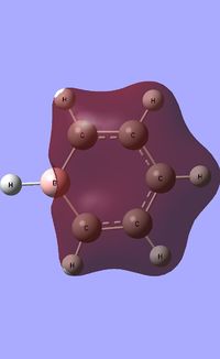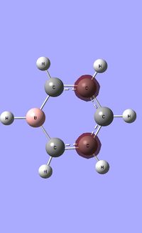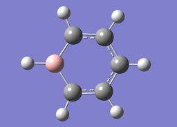 A Boratabenzene molecule was created using GaussView by replacing a C-H unit within benzene with a B-H unit. The molecule was subjected to an optimisation calculation [OPT] using B3LYP as the method and a basis set of 6-31G(d,p).