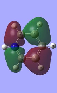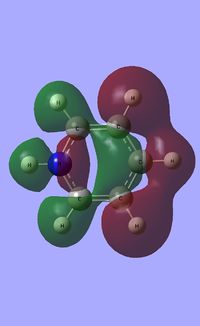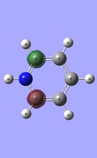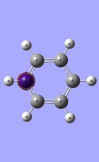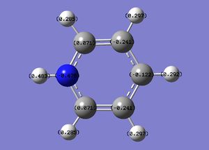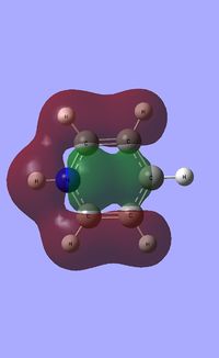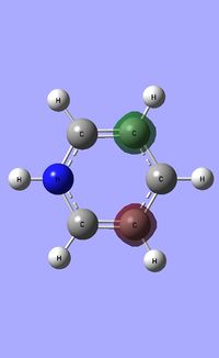 A Pyridinium molecule was created using GaussView by replacing a C-H unit within benzene with N-H. The molecule was subjected to an optimisation calculation [OPT] using B3LYP as the method and a basis set of 6-31G(d,p).
