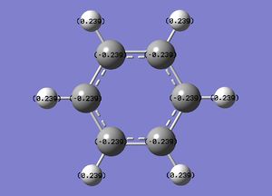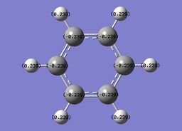 Benzene contains a conjugated C-C system, with pi electron density observed above and below the ring structure. Each C-C within the conjugated system has sp2 hybridisation. Given, the D6H point group of benzene, there is a symmetric distribution of charge observed throughout the molecule. Each carbon atom has a charge of -0.239, with each hydrogen attached within the molecule exhibiting an equal and opposite +0.239 charge. This is consistent with the increased electronegativity of carbon relative to hydrogen.