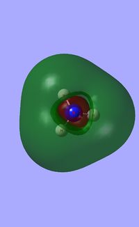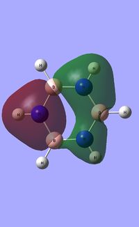 The specific NBO charges for nitrogen,boron and hydrogen were then analsyed. Nitrogen [electronegative] has a charge of -1.102 with the assocaited hydrogen holding a charge of +0.432. Conversely, each boron [electropositive] holds a charge of +0.747 with the attached hydrogen possessing a charge of -0.077.This is shown in the image below.