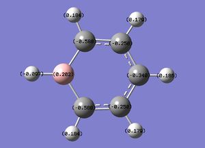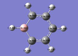Boratazine contains a 6-membered ring as observed in benzene, with one C-H unit displaced by a B-H unit. The two molecules are isoelectronic, yet unlike the neutral benzene molecule, boratazine contains a formal negative charge. Despite being isoelectronic the NBO analysis yields significant disparities between the two molecules. The single boron atom possess a chargge of +0.202, with its associated hydrogen carrying a charge of -0.097. This reflects the electropositivity of boron compared to the hydridic bonded hydrogen. The presence of the sp2 boron atom within boratabenzene causes a significant disruption to the pi electron density observed within benzene. Whereas, in the case of benzene a symmetric charge distribution was observed, within boratabenzene the electron denisty is polarised towards the carbons ortho to the boron atom. Thus, both ortho carbons hold a higher proportion of charge [-0.588] relative to the charge observed on the meta [-0.250] and para [-0.340] carbons. Each "C-H" hydrogen carries a positive charge owing to its electropositivity relative to carbon.