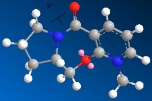 As with the previous molecule, molecule 2 was modelled in 3D using Chemdraw 3D and then the energy was minimised using MM2 calculations to find the most thermodynamically stable and therefore favourable conformer of the molecule. Many local minima were found for this molecule but from the datat it is clear that the thermodynamically most stable conformer has the carbonyl group orientated below the plane fo the pyridine ring.