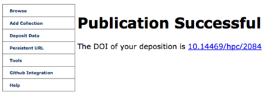 To add data to your collection click Deposit Data. Choose the file(s) you would like to upload, add a title and a description. Uploading each file individually is advised (click add file to choose another file another) and once the files are uploaded select the data to be a Member of the relevant collection. Click submit. A DOI for the data deposition is created.