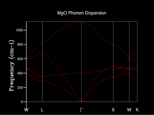 An initial calculation was completed on the MgO model at zero Kelvin and zero pascals. The primitive cell, which is a rhombohedron, has a lattice constant of 2.9783 Angstroms. This can be shown that this is equivalent to the cubic length of 4.212 Angstroms; this is good correlation to the literature value which is 4.211 Angstroms.[2] This is expected as the calculations at 0 K so does not take into account anharmonic factors, which could lead to inaccuracy during this section as there can be difficulties in modelling anharmonic properties.
