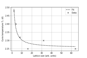 4. Find the temperature at which the maximum in C occurs for each datafile that you were given. Make a text file containing two colums: the lattice side length (2,4,8, etc.), and the temperature at which C is a maximum. This is your estimate of for that side length. Make a plot that uses the scaling relation given above to determine . By doing a little research online, you should be able to find the theoretical exact Curie temperature for the infinite 2D Ising lattice. How does your value compare to this? Are you surprised by how good/bad the agreement is? Attach a PNG of this final graph to your report, and discuss briefly what you think the major sources of error are in your estimate.