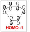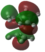 The HOMO-1 of the transition state is comprised of contributions from the LUMO of ethylene and the HOMO of cis-butadiene. It is antisymmetric with respect to the plane.