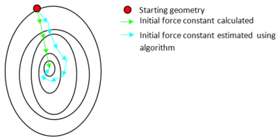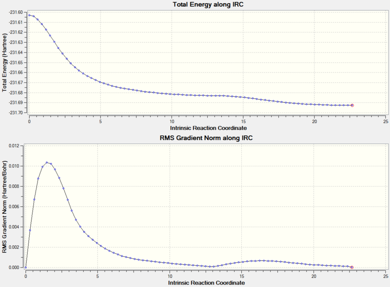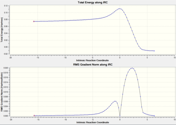 Now a transition state has been found, it's now important to prove that this transition states connects the two expected minima. An AM1 IRC calculation was performed on the AM1 optimised transition state structure. Force constants were calculated at every step and the IRC was calculated forwards and backwards. DOI:10042/to-8128