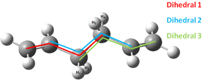 The second effect to be considered is Van der Waals interaction. A larger number of attractive Van der Waals interactions between hydrogens may exist in the Gauche conformer, analogous to the case seen for n-butane. [5] This so called "Gauche-effect" is especially abundant in large alkane chains, where "hairpin" structures are formed via Gauche linkages in order to maximise attractive Van der Waals forces. [6]