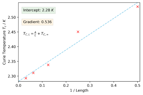 Using the Equation 7 we can use our estimated values of the Curie temperature found by fitting the polynomials on the peaks of the specific heat capacity curve for each system size to get a estimated value for the curie temperature for an infinite lattice size by simply plotting the Curie temperature against 1/L and performing a linear fit to extract the values for the gradient and intercepts. This analytic solution was found by Lars Onsager.[7]
