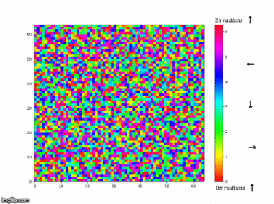 Our system used for this simulation so far has been for a uniaxial system in which the spin state is binary. As an extension task we thought it would be cool to look at a system in which the spins can adopt any angle between . Instead of considering the spin state to be either +1 or -1 it was considered to be anywhere from . The energy function works in a similar manner except we are now calculating the interaction energy as how much the spins overlap in a certain direction and similar for the magnetisation function which is considering a vector sum of all the spins in the system to find the net magnetisation with the help of an extra function abz() used to calculate the absolute magnitude. There is a colour bar (in radians) plotted by the side to show the colour mapping to the direction in which the spin states are pointing and a colour map that was cyclic was necessary in order to show the interactions well. At the start of the simulation we can see that there is a random distribution of spins in directions in the range of , we can see that as the simulation goes on for longer small domains of similar spin states start to form and as we go on for even longer these areas of magnetic domains start to grow and grow, this makes sense as the system is trying to find the minimum energy conformation which is being lowered by decreasing the surface area of these clusters. In Figure 51 we can see that the energy decreases as this is what we would expect when these magnetic domains form as they are areas where the spins are aligned and minimising the energy. The magnetisation starts off at 0 as the random distribution should have an equal amount of spins in any direction thus making the magnetisation 0. At time goes on and the magnetic domains start to form and increase there is some deviation from zero as there is no longer a even distribution in all directions but now groups of spins in certain directions and depending on the relative sizes a net magnetisation is created.