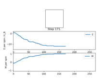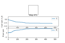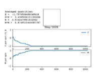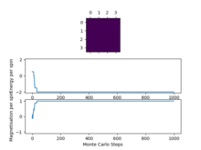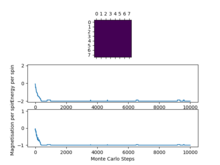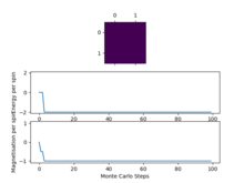 TASK: Implement a single cycle of the above algorithm in the montecarlocycle(T) function. This function should return the energy of your lattice and the magnetisation at the end of the cycle. You may assume that the energy returned by your energy() function is in units of ! Complete the statistics() function. This should return the following quantities whenever it is called: , and the number of Monte Carlo steps that have elapsed.