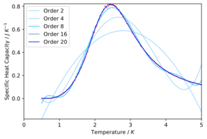TASK: Modify your script from the previous section. You should still plot the whole temperature range, but fit the polynomial only to the peak of the heat capacity! You should find it easier to get a good fit when restricted to this region.