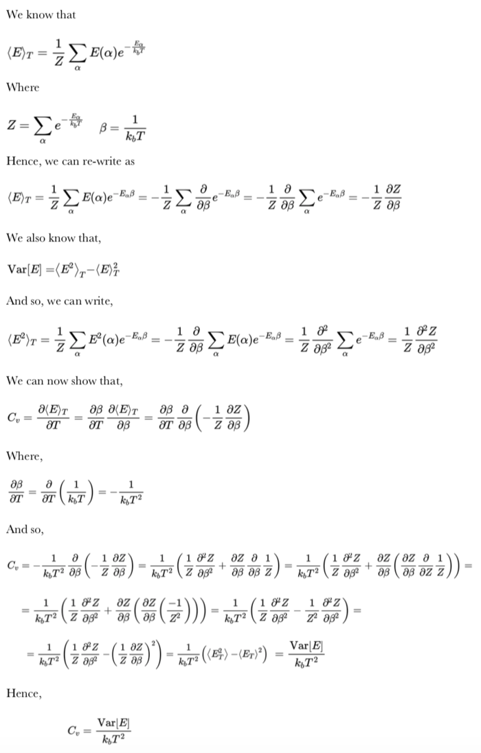We now want to find a formula we can use to calculate the specific heat capacitie at a given temperature using the statistics that we have. We require the specific heat capacity in order to help us find the curie temperature.