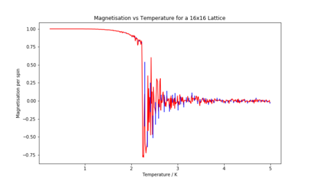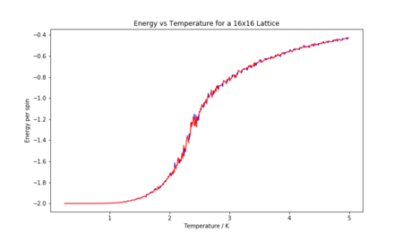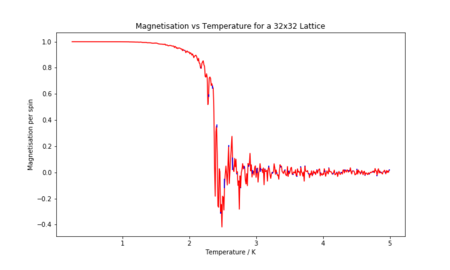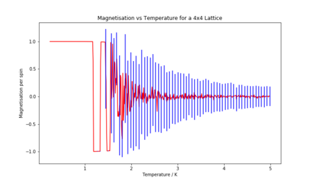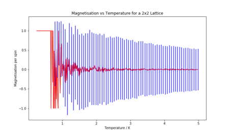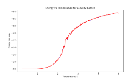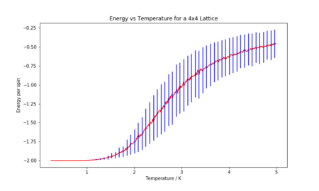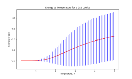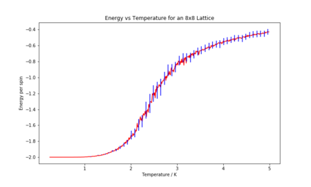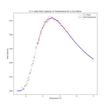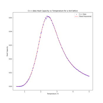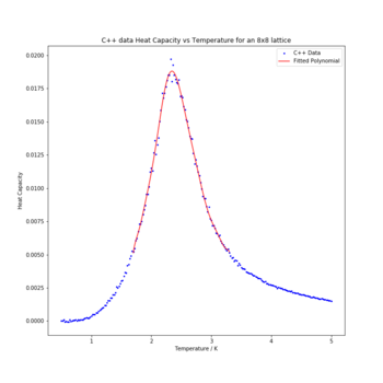 From the curvefit, the value for can be extracted and is found to equal 2.279 K (4 s.f.). The theoretical exact curie temperature for the infinite 2D Ising Lattice has been calculated to be equal to 2.269 K (4 s.f.)1. My calculated value is surprisingly close to the theoretical exact value, considering the scaling relation plot has only been generated using 6 datapoints. From observing this plot, it is clear that the datapoints do not lie exactly along the curvefit plotted, and inaccuracy in the curvefit is likely a large source of error. There are minor errors throughout in peak fitting and variations in energy from montecarlo, which may result in datapoints not lying exactly on the correct relation curve, however with more datapoints (i.e. more lattice sizes) the relation curve could be more accurately generated and thus the value for calculated more accurately.