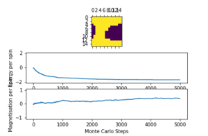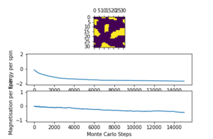 TASK: Implement a single cycle of the above algorithm in the montecarlocycle(T) function. This function should return the energy of your lattice and the magnetisation at the end of the cycle. You may assume that the energy returned by your energy() function is in units of k_B! Complete the statistics() function. This should return the following quantities whenever it is called: <E>, <E^2>, <M>, <M^2>, and the number of Monte Carlo steps that have elapsed.
