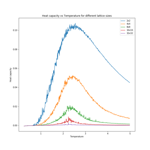 The temperature at which the maximum in C occurred, along with the corresponding lattice size, was recorded in the datafile Curie Temperature for different lattice sizes linked here.