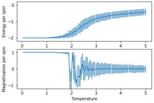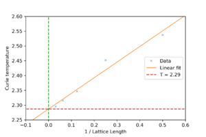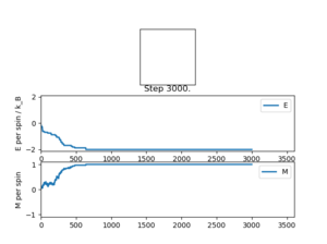 With this fix in place, the script can be used to find properties of the system. By starting with an aligned lattice at a low temperature then repeatedly raising the temperature by a small interval and letting the system equilibriate, the point at which entropy starts to dominate can be found.