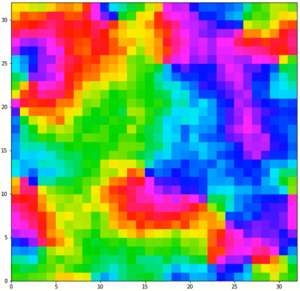 The simulation script was modified to allow for any spin direction in 2 dimensions. Animations were made by mapping the angle of the spins onto a hsv colourmap.
