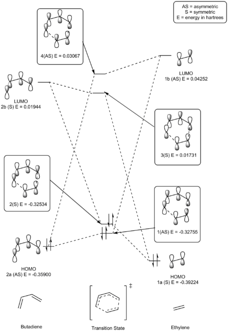 The 4 + 2 cycloaddition reaction between ethylene and butadiene (S-cis conformer) is shown in scheme 1. Reactant fragment orbitals (FO) and TS MO's can be described as being symmetric (S) or anti-symmetric (AS). As shown in Table 2 and illustrated in figure 4, only orbitals of the same symmetry can combine, either constructively or destructively. Relative energies for each MO have been presented in Hartrees and correlate to the fully optimised (PM6 level), lowest energy structures.