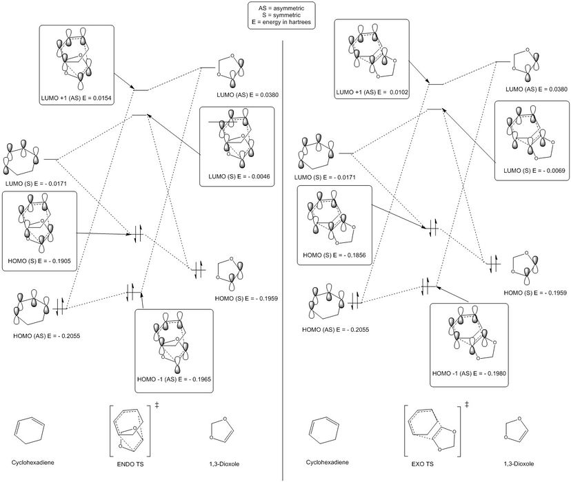 The 4 + 2 cycloaddition reaction between cyclohexadiene and 1,3-dioxole can take one of two pathways through an ENDO or EXO TS, as shown in scheme 2, giving rise to two stereoisomer products. MO's for each reaction pathway are shown in figure 7. Note that the energies provided for the reactant molecules in figure 7 have been determined through individual optimizations of each starting reactant at the B3LYP/6-31G(d) level.TS MO's for both ENDO/EXO pathways have been provided in Table 4 (corresponding MO's can be seen in figure 7). Again, the aforementioned symmetry rules have been obeyed (S-S or AS-AS = non zero overlap and AS-S = zero overlap). The energy splitting between the HOMO-LUMO TS MOs for each the ENDO and EXO case is 0.1859 Hartrees and 0.1787 Hartrees, respectively. The energy splitting between the HOMO-1 - LUMO+1 TS MOs for each the ENDO and EXO case is 0.2219 Hartrees and 0.2082 Hartrees, respectively . Interestingly, the ENDO HOMO (S) TS MOs is lower in energy than the equivalent EXO TS MO. There is marginal difference between the energies of the HOMO-1 TS MOs of each ENDO and EXO pathway. These results imply that the ENDO TS is the lower energy structure. This will be confirmed through compuational thermochemical analysis (see below).