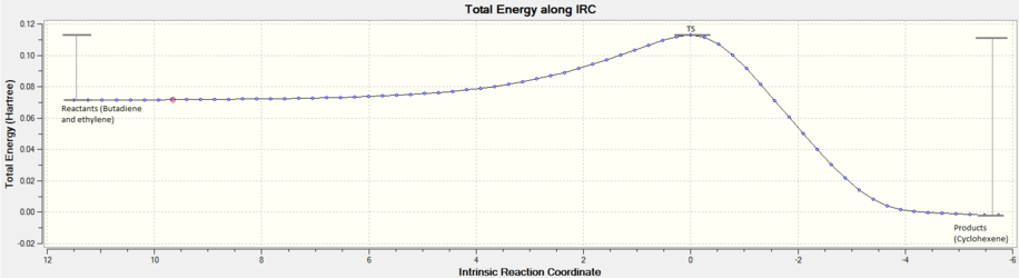 In the reaction two new bond are formed between C1-C6 and C4-C5, in the TS these distances are equal at 2.115 Å, which lies as an intermediate value between a single C-C bond length and twice the Van der Waals radius of the C atom (1.7 Å). [7] These observations fit with theory, where the TS is an intermediate structure between the two reactants when bond breaking/forming occurs. From observing the IRC for this reaction, figure 5, it can be seen that the TS is closer in energy to the reactants than products indicating an early stage TS. [8] The bonds formed are both sp3 hybridised C-C single bonds of 1.537 Å, which lies in excellent agreement with literature (1.54 Å for C-C single bond). In the TS both distances (C1-C6 and C4-C5) are equal which indicates synchronous bond formation. This is further supported by the reaction path vibration in the TS (negative vibration), as shown in Figure 6 where the termini of each reactant move towards each other simultaneously.