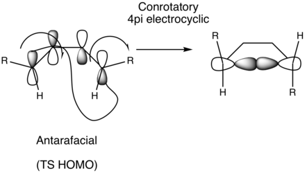 (All these calculations are occurring on the ground state. Visualisation of the IRC or transition vector from a frequency calculation would confirm that 4pi electrocyclic reactions occur with disrotation Tam10 (talk) 15:56, 4 April 2018 (BST))