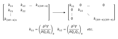 Energies obtained through employment of these methods will allow for the exploration of the PES of each molecular system studied in which there are 3Natoms-6 degrees of freedom. In this regard, the PES explored is for 3N atoms, where only the internal motions of the molecule result in a change in potential energy and not the external motions such as translations and rotations, hence the subtraction of 6. [4] . In particular, this work is primarily focused on locating stationary points on the surface (first derivatives or gradients) and then determining the curvature at these points to elucidate whether they are minima or saddle points , which is indicated by the second derivative at these points. This second derivative value is equated to the force constant, k, of the system at this point. The second derivative at each point (minima, saddle point etc.) on the PES is evaluated using a Hessian matrix and the force constants are obtained through diagonalisation of the Hessian matrix, as illustrated in figure 2, in addition to the contributions to each degree of freedom, i.e. normal modes. A minimum on the PES corresponds to reactants or products and is a point from which a small displacement in any direction increases the energy, thus the second derivative is positive. A saddle point corresponds to the TS as is located between two minima. Murrell and Laidler defined a TS as a stationary point with a single negative Hessian eigenvalue, which corresponds to a negative force constant and thus a single imaginary normal mode frequency. [2]