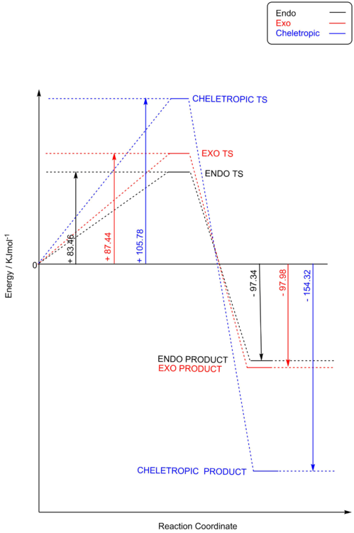 It can be seen from both Table 7 and figure 13, that the lowest energy barrier is associated with the ENDO reaction pathway and the most negative reaction energy is associated with the CHELETROPIC reaction pathway. These results indicate that the ENDO product is the kinetic product and the CHELETROPIC product is the thermodynamic product.