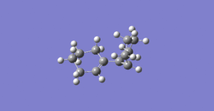 | Figure 18. HOMO of TS (Möbius topology) for [1,1']bicyclohexyl-1,1'-diene electrocyclisation | Figure 19. Negative vibration of the TS for the [1,1']bicyclohexyl-1,1'-diene electrocyclisation, bonds move in a controtatory fashion | ||||