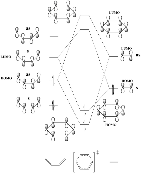 The following MO diagram depicts the formation of the four MOs of the cyclohexene transition state from the HOMOs and LUMOs of butadiene and ethene. Though not shown on the diagram, it should be noted that the total energy of the TS orbitals will be higher than that of the reactants, as the TS is at the maximum in terms of energy on the reaction coordinate.