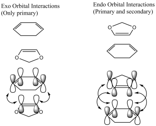 Below is a diagram which depicts the orbital interaction that occur throughout both the endo- and exo-transition states.