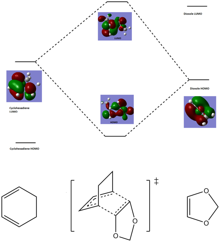 Below is a molecular orbital diagram, constructed using the endo-Diels Alder reaction orbitals from above. The cyclohexadiene LUMO is higher in energy than the dioxole HOMO. This is proven by the fact that the transition state HOMO receives more orbital contribution from the dioxole HOMO orbital.