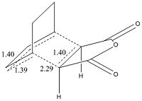 The exo had to be modified as the guess structure was not accurate enough guess as the CH2 can be seen to be much more sp3 hybridised than the guess of the endo structure. The important c-c bond lengths have been depicted for the exo(left) and endo(right). All bond lengths are in Angstrom and opposite sides are of the same value bond length due to the symmetry. It is observed that in both cases bonds involved in the cyclic reaction are all ~1.40Angstrom showing that the electron density is evenly distributed in the transition state. The two forming sigma bonds are however of different value the bonds are smaller. This would suggest a transition state closer to the product and that the two parts are drawn together closer at the transition state.
