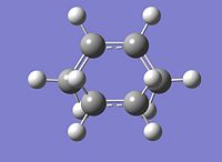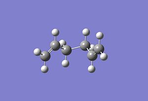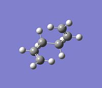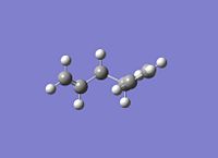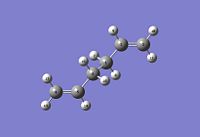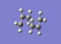 An allyl fragment of (CH2CHCH2) was optimised using Hartree-Fock method and a low level 3-21G basis set[7]. The optimised fragment was then copied and two were amalgamated to form an approximate transition state for the chair structure with an aproximate distance of 2.2Angstrom between terminal carbons of both allyl fragments.