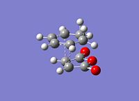 The previous anti product was further optimised by increasing the basis set for a better desription of the Molecular Density. The calculations were made with a different method of DFT instead of HF with a higher basis set of 6-31G. The geometry is very similar and therefore there is only minor refinement to the geometry. The energy is reduced due to a lower potential minima found with higher accuracy calculations. Thermochemical data can be obtained from the resulting optimised date. The values are defined as; E0K is the sum of electronic and zero-point energies, E298.15K is the sum of electronic and thermal energies, H is the sum of electronic and thermal enthalpies and finaly G is the sum of electronic and thermal free energies. These energies can be compared with other isomers if the same basis set and method of calculation is used.