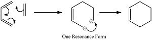 It is worth noting that the local symmetry of the ethene and the cisbutadiene resemble the overall symmetry. Therefore analysing the frontier HOMO the symmetrical MO of cisbutadiene is therefore its LUMO and the corresponding frontier MO of Ethene is it's symmetrical HOMO. As both are symmetrical a concerted reaction is allowed. It can therefore be deduced that this reaction proceeds via a Ethene-Cisbutadiene HOMO-LUMO concerted reaction respectively.