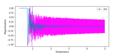 Secondly, the temperature at which the magnetisation drops increases as the lattice size increases. This can be attributed to long range fluctuations. It is a characteristic of phase transitions that large fluctuations in the system occur over long ranges. This can be seen as the lattice size increases from 2x2 → 16x16. The magnetisation begins to fluctuate drastically at a much lower temperature than the Curie temperature for the 2x2 system, and the temperature at which this fluctuation occurs increases as the lattice size increases. However, the size of the fluctuation also decreases in size as lattice size increases. In the 32x32 lattice simulation, fluctuations only begin to occur once the phase transition begins. Therefore, a lattice size of 16x16 is large enough to capture the long range fluctuations.