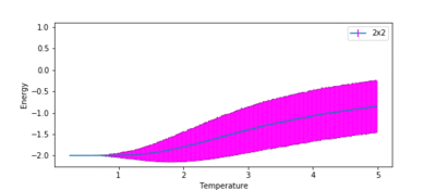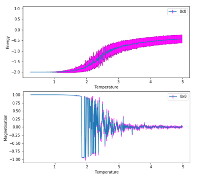 Error bars are added to the graphs to give a sense of how much the average energy/magnetisation fluctuates at a given temperature. As expected, the error in energy increases as temperature rises. This is due to randomly flipped spins being more likely to be accepted at a higher temperature, varying the energy even more. The opposite occurs in the magnetisation. As temperature increases, the error bars shrink. This is because the ratio of up and down spins tend to 1:1 at temperature increases. Therefore the magnetisation gets closer to zero, and the error in this reduces consequentially.