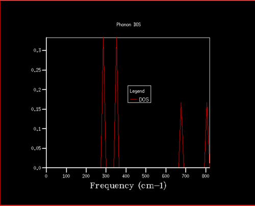 The density of states plot for the phonons were found using the Phonon DOS setting on the Execute GULP panel. The shrinking factors used were 1 for A, B and C corresponding to a 1x1x1 grid. This experiment was then repeated for the same grid sizes as before: 2x2x2, 3x3x3, 4x4x4, 8x8x8, 16x16x16, 32x32x32 and 64x64x64. The free energies were recorded from the log file taken from each simulation and then compared. It was observed that the 2x2x2 grid size produced an accurate free energy to 1 meV and to 0.5meV where the 3x3x3 was needed for an accurate value to 0.1 meV.