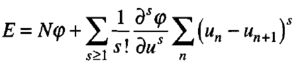 The Harmonic approximation is a model consisting of a linear chain of atoms where each atom only feels the force of its immediate neighbour (force termed the nearest neighbour interaction). This assumes that the interactions between other atoms are negligible due to a greater distance between them and large screening between the atoms. If we take a linear chain of N atoms, the forces between the neighboring atoms can be represented by a potential function which is dependent on the distance between the atoms (r). Thus the energy of this linear chain can be shown in equation 1. [4]