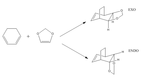 This exercise invovled the Diels-Alder cycloaddition between cyclohexadiene and 1,3-dioxole forming exo and endo products. The transition state for this structure is more complex. This coupled with the fact that the products structure could be easily constructed in Gaussian concluded in method 3 being used as this was the most reliable way of locating the transition state structure. In order to find both transition state structures, the orientation of the 1,3-Dioxole was changed to above or below the cyclohexadiene ring to change from the exo and endo reaction pathways. The reactants, transition state and product were all optimised at the PM6 level and B3LYP levels. As a result of the B3LYP calculation, this exercise was computational more expensive than exercise 1 and thus took longer.